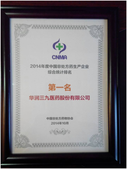 10月15日-16日,由中國非處方藥物協(xié)會主辦的“第十一屆中國自我藥療年會”在長沙召開。會議公布了2014年度中國非處方藥綜合統(tǒng)計排名及第二屆非處方藥品牌傳播獎獲獎名單,華潤三九喜獲多項榮譽。其中,公司綜合排名繼2013年度之后,再次位居中國非處方藥生產(chǎn)企業(yè)榜首。