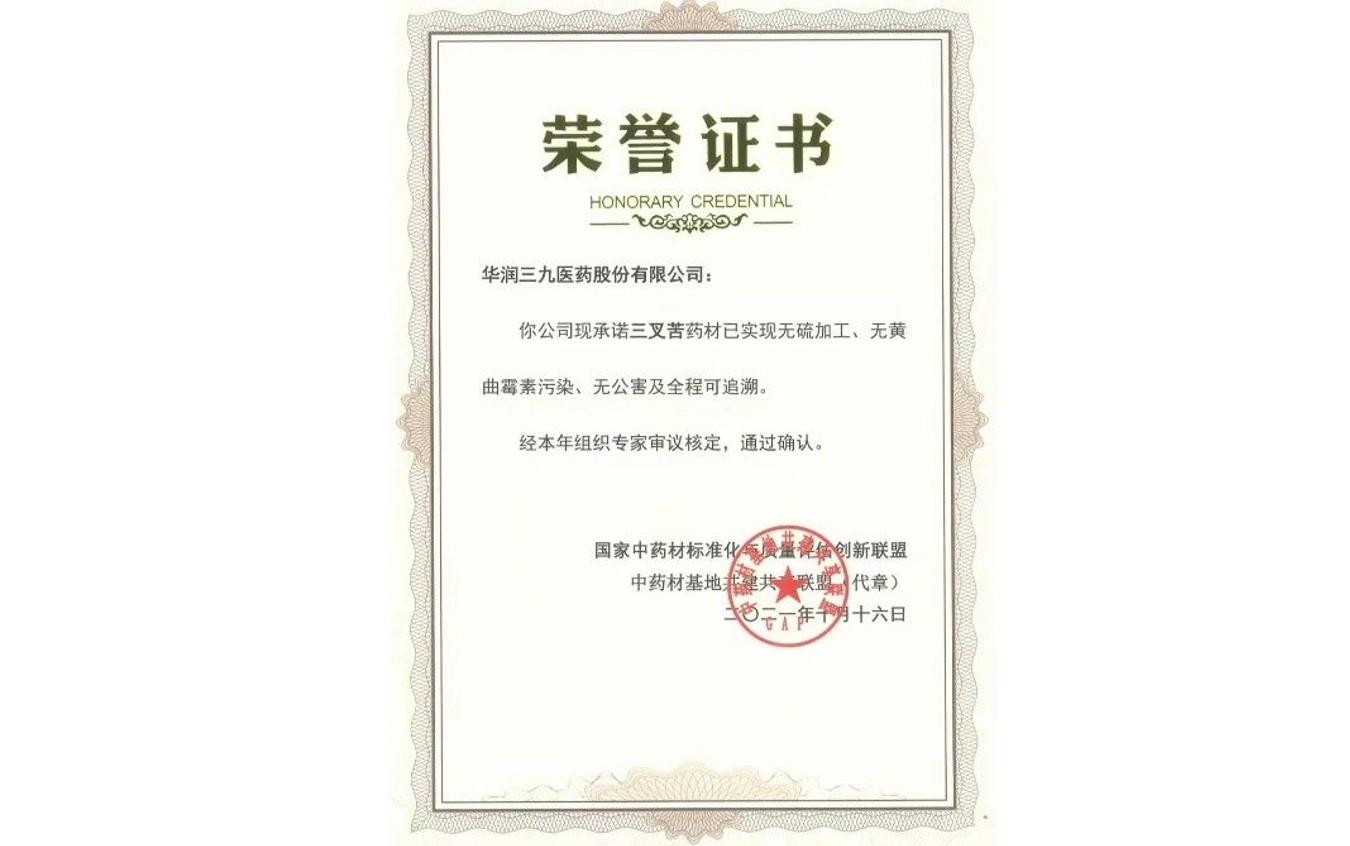 10月16日,在南寧召開的第九屆中藥材基地共建共享聯(lián)盟交流大會上,華潤三九申報的“三叉苦”藥材獲評“三無一全”優(yōu)質(zhì)藥材,并頒授品牌品種證書?!叭裏o一全”證書由國家中藥材標(biāo)準(zhǔn)化與質(zhì)量評估創(chuàng)新聯(lián)盟頒發(fā),要求在中藥材生產(chǎn)過程中實現(xiàn)無硫加工、無黃曲霉素污染、無公害及全程可追溯。