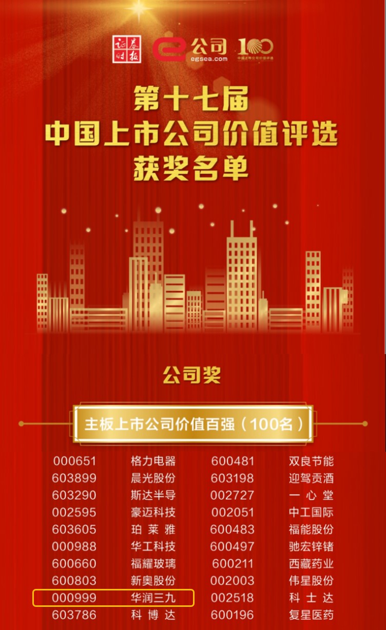 了解更多>>>華潤(rùn)三九獲評(píng)第十七屆中國(guó)主板上市公司“價(jià)值百?gòu)?qiáng)”