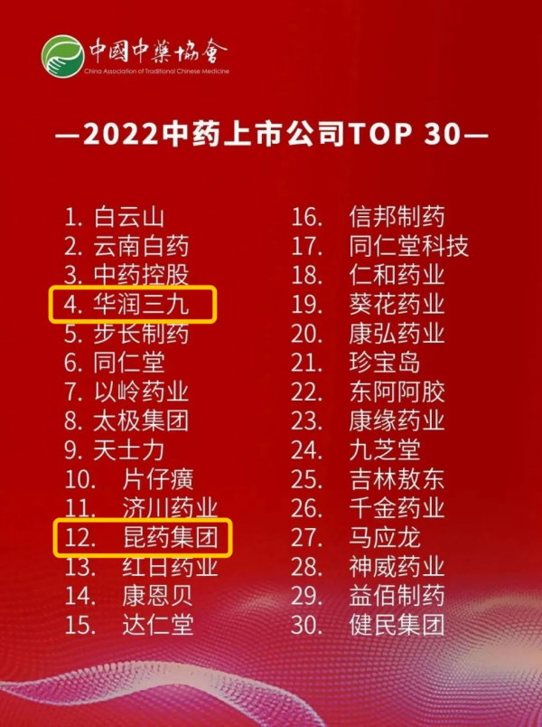 近日,由中國中藥協(xié)會主辦的“第三屆中國中藥品牌建設大會”在北京召開,華潤三九及旗下昆藥集團均入選“2022中藥上市公司TOP30”榜單。
