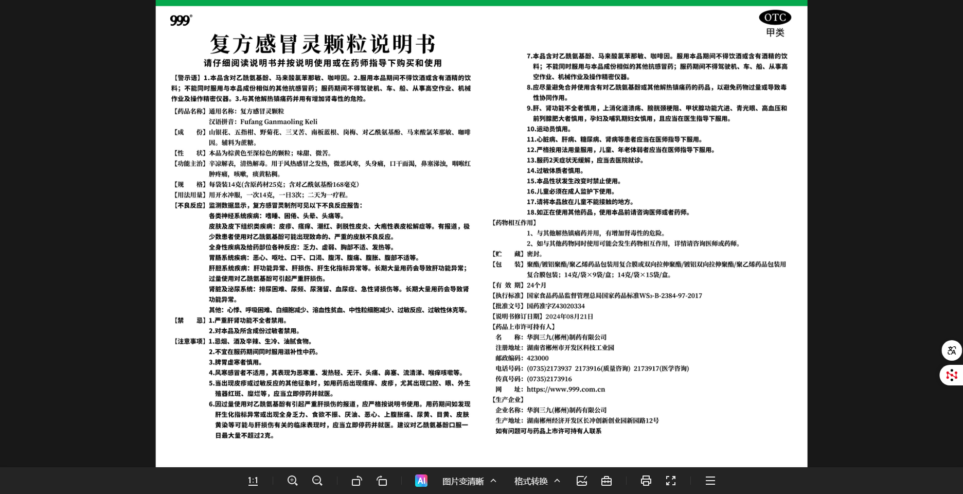 2024年7月2日,國家藥監(jiān)局發(fā)布了 《關于修訂復方感冒靈制劑和銀黃口服制劑說明書的公告》(2024年第81號),按照公告精神進行了說明書修訂,于2024年8月21日獲得備案。