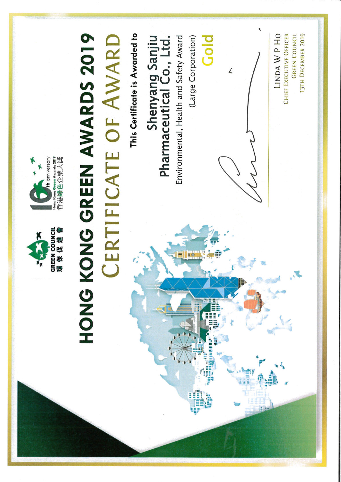 2019年12月,沈陽三九榮獲香港環(huán)保促進會“香港綠色企業(yè)大獎-超卓環(huán)保安全健康獎”金獎。