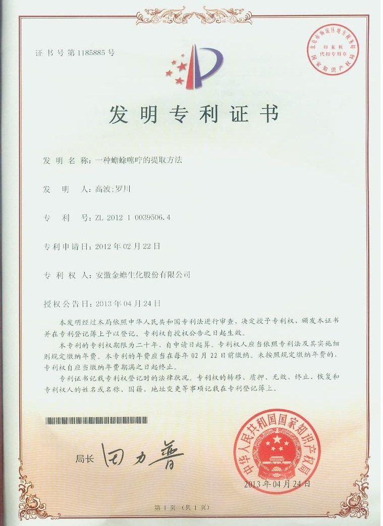 安徽華潤金蟾藥業(yè)股份有限公司申請的“一種蟾蜍噻嚀的提取方法”發(fā)明專利,近日獲得了國家知識產(chǎn)權(quán)局的專利證書,專利號:ZL201210039506.4。此項專利是華潤金蟾在產(chǎn)品深度研發(fā)和知識產(chǎn)權(quán)保護方面取得的又一項重大成果。