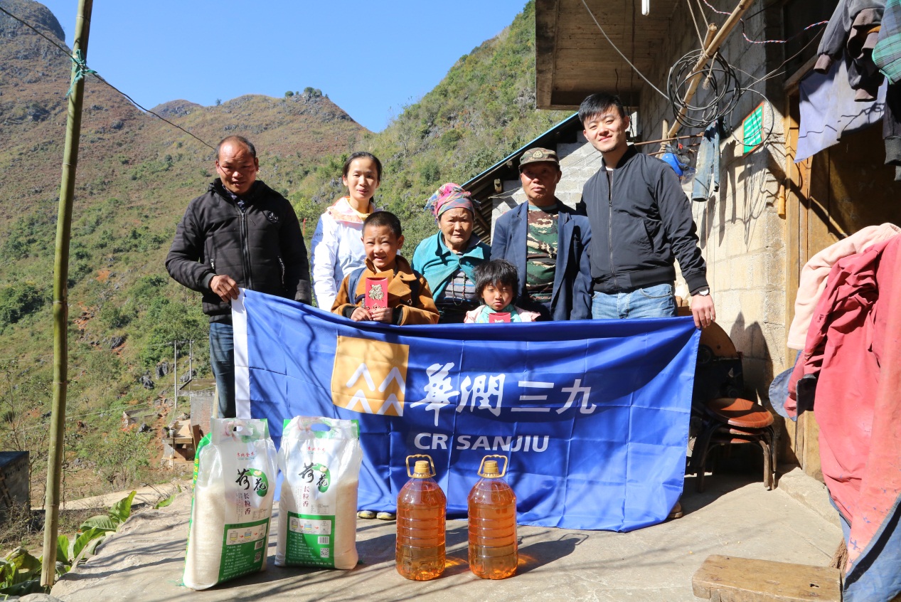 12月16日,華潤三九及華潤萬家代表等一行9人,在西林縣那佐鄉(xiāng)龍灘小學校長侯少東(97年出生)的帶領下,翻山越嶺,腳踩泥濘,走進龍浪屯,為學校的貧困孤兒及家庭送去冬天米油糧食與其他物資?! ?/big>