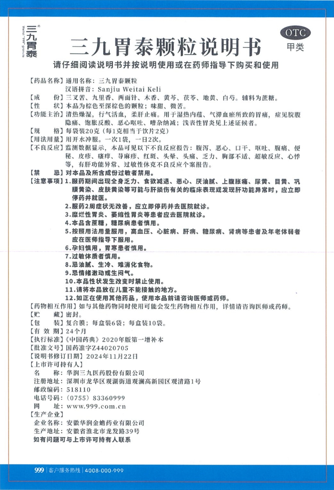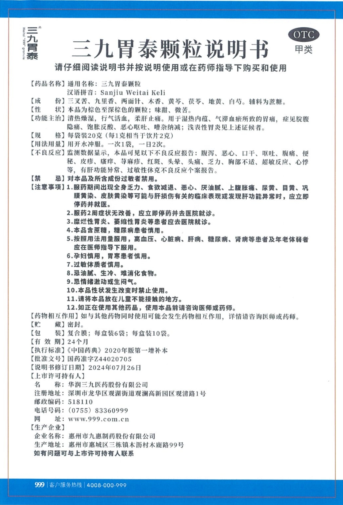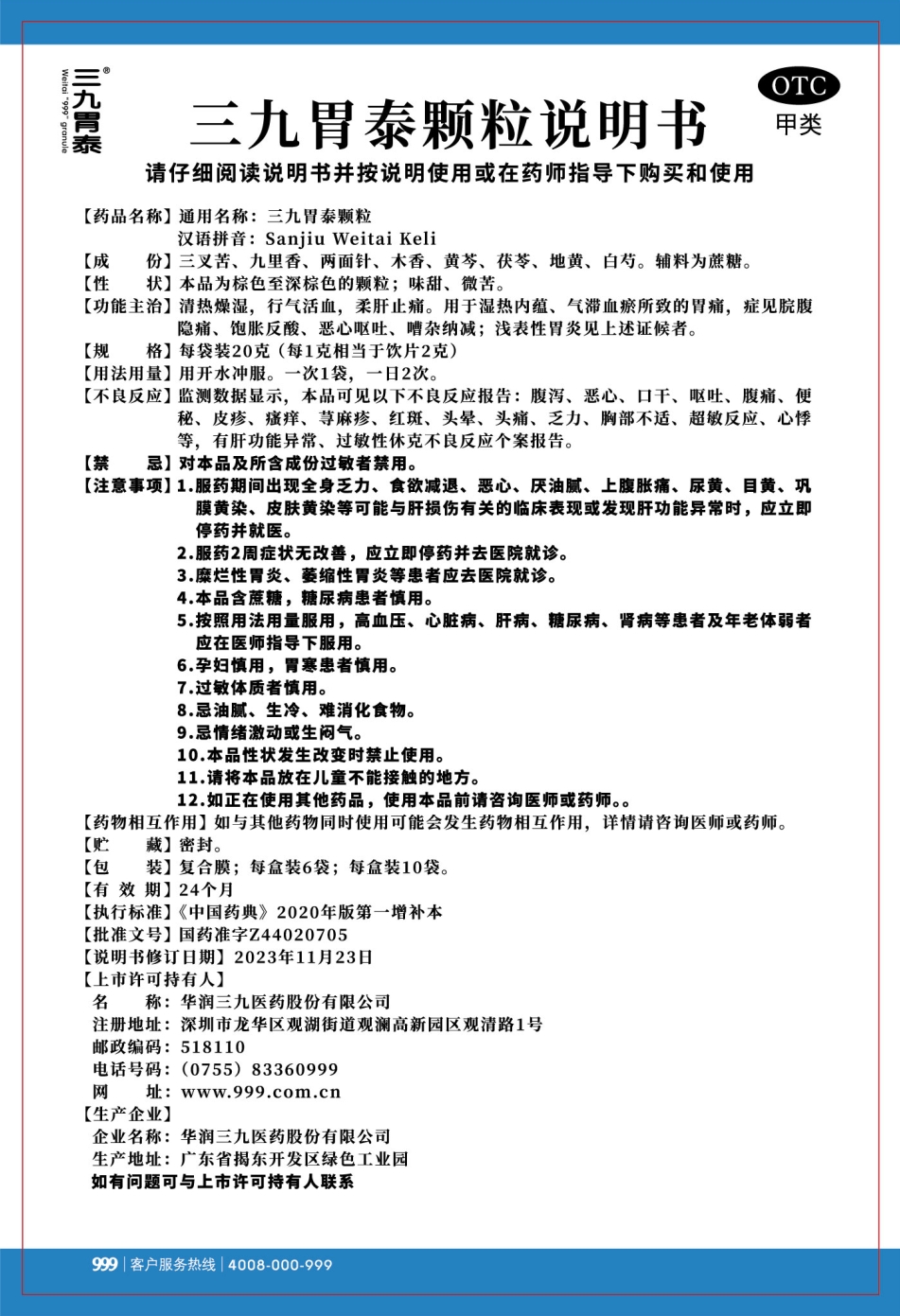三九胃泰顆粒20g說明書[觀瀾2401版]
