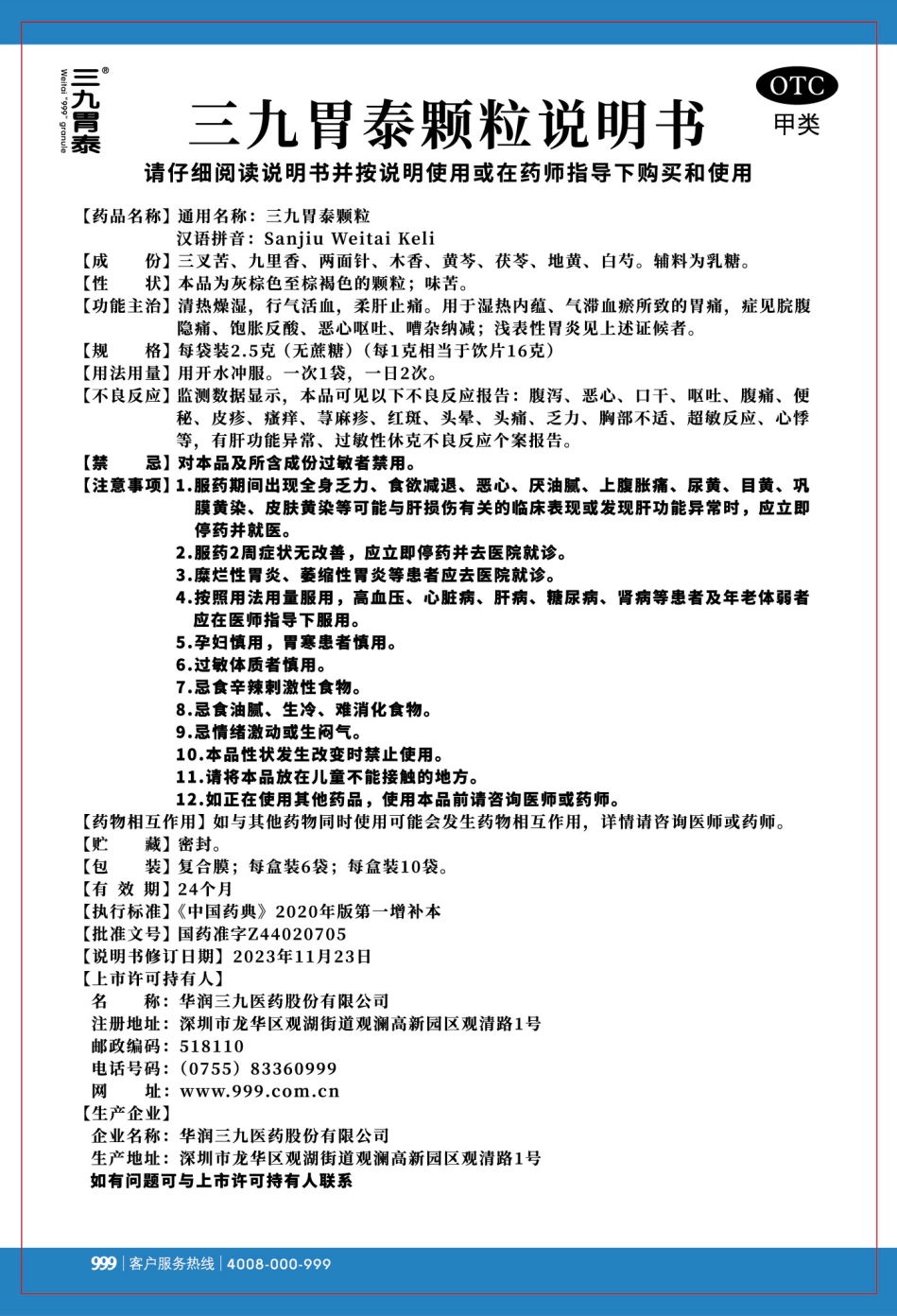 三九胃泰顆粒(2.5g無蔗糖)說明書[觀瀾2401版]